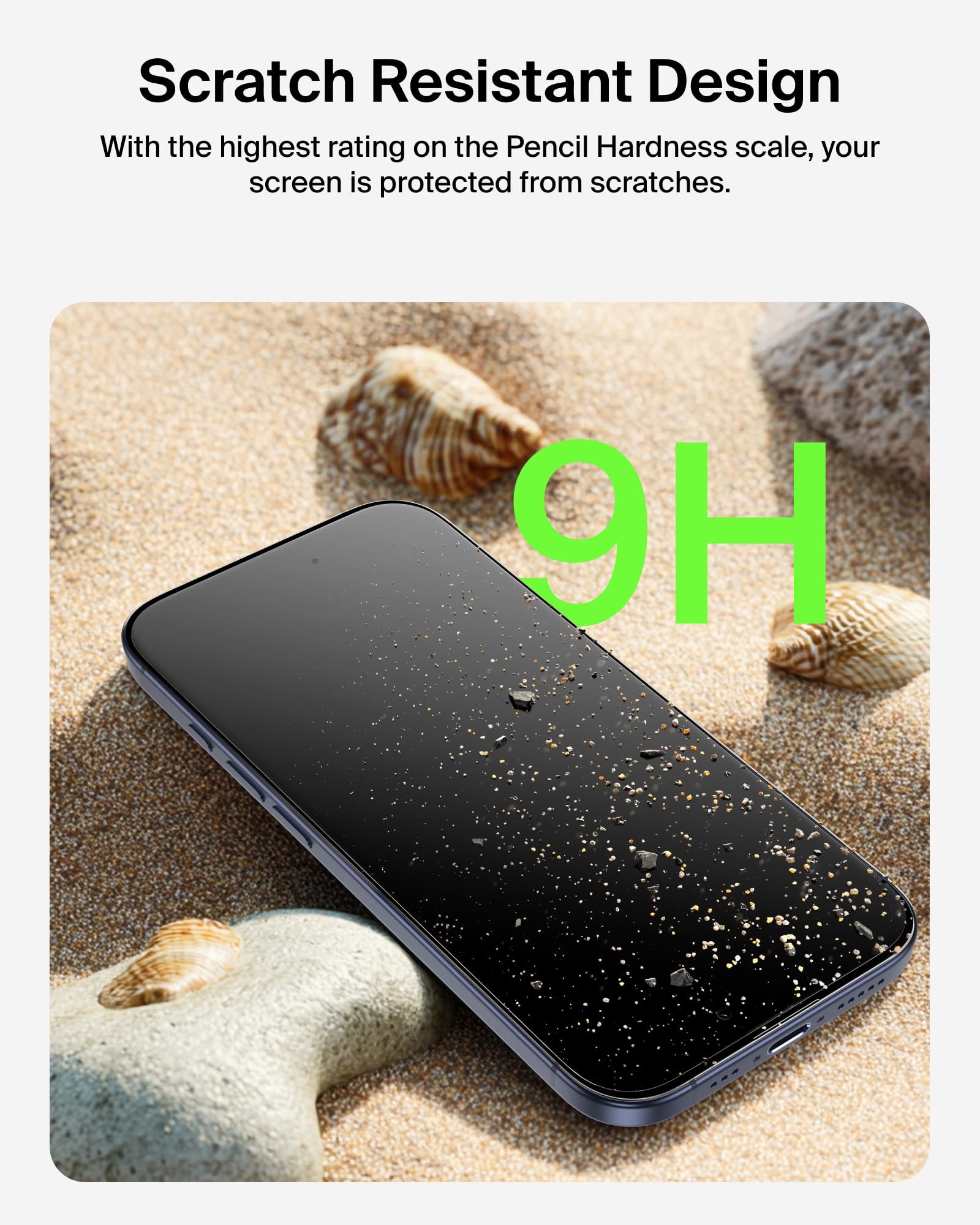 - 9H PENCIL HARDNESS RATING: Engineered for superior durability, this iPhone screen protector resists scratches from keys, coins, and everyday wear to keep your screen looking like new while maintaining smooth touch sensitivity and crystal-clear clarity.**