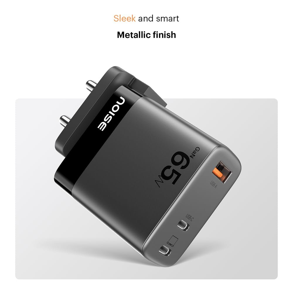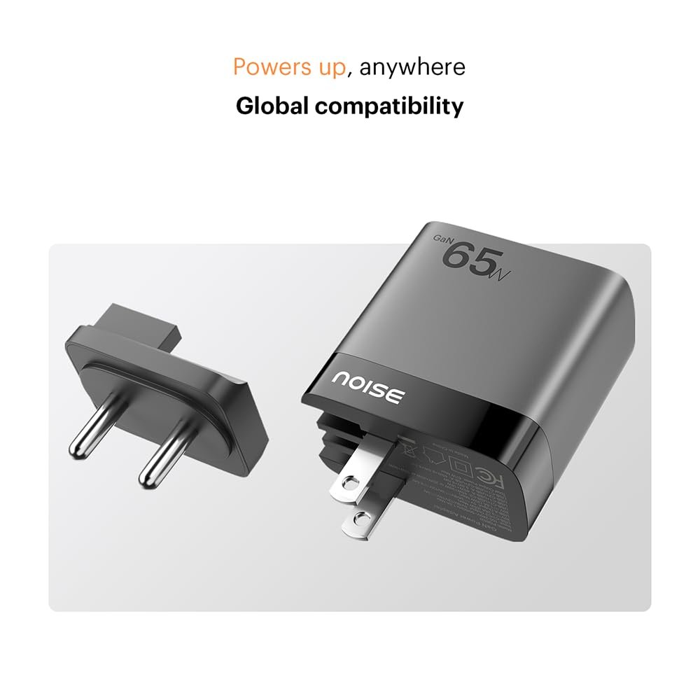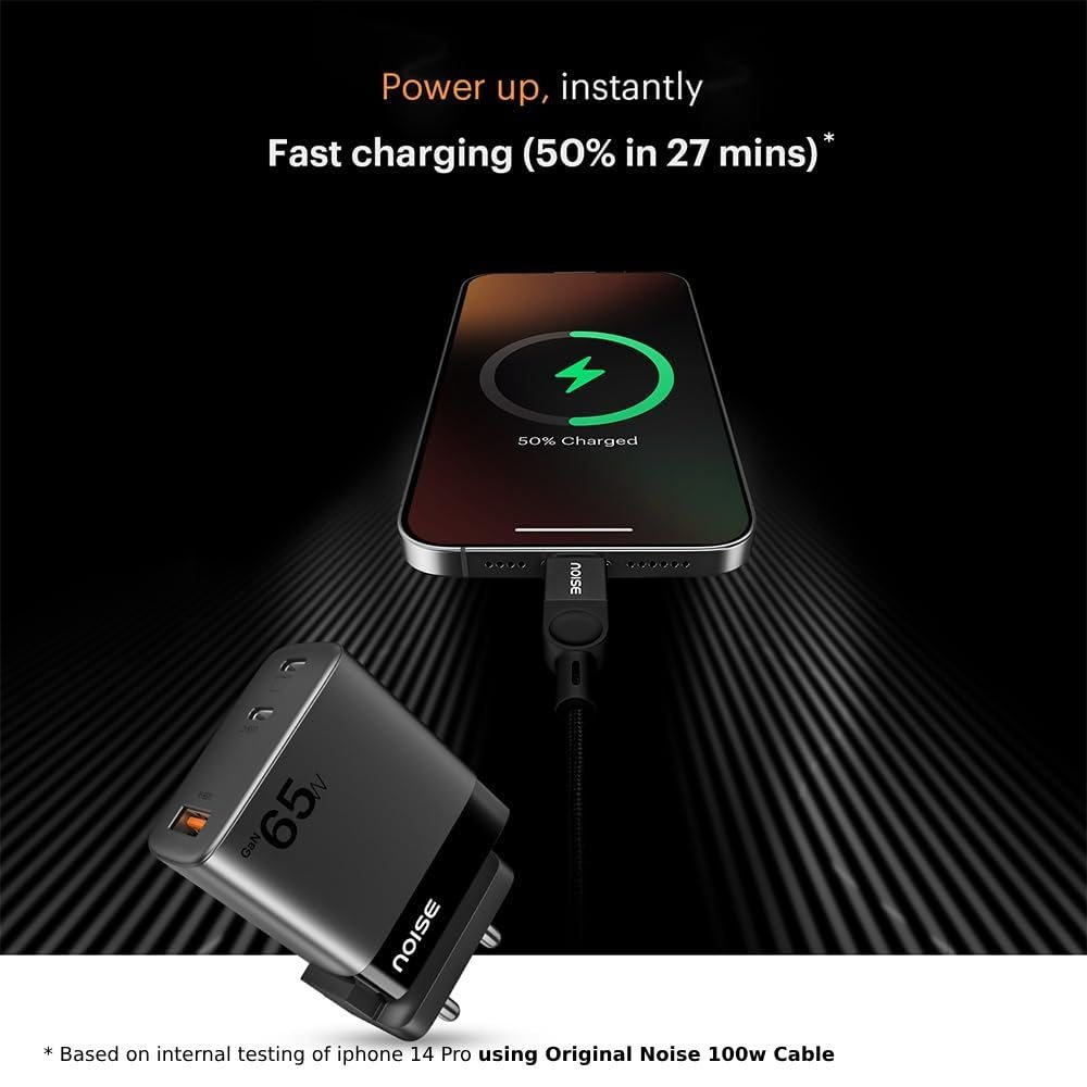 - Fast Charging: Power up your device up to 50% in just 27 minutes*. The maximum rated capacity of the adapter is 65w. The max output required for laptop & phone fast charging will be achieved only when using a certified and compatible cable rated for 65w+ output. For best results use Original Noise 100w Braided Cable compatible with all adapters. (*0-50% in 30mins achieved via internal testing on iphone 14 pro using Original Noise 100w cable)