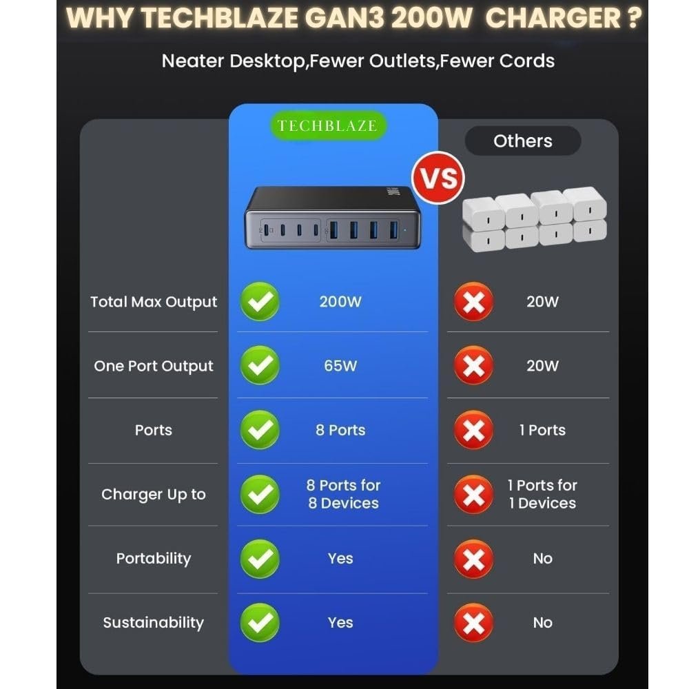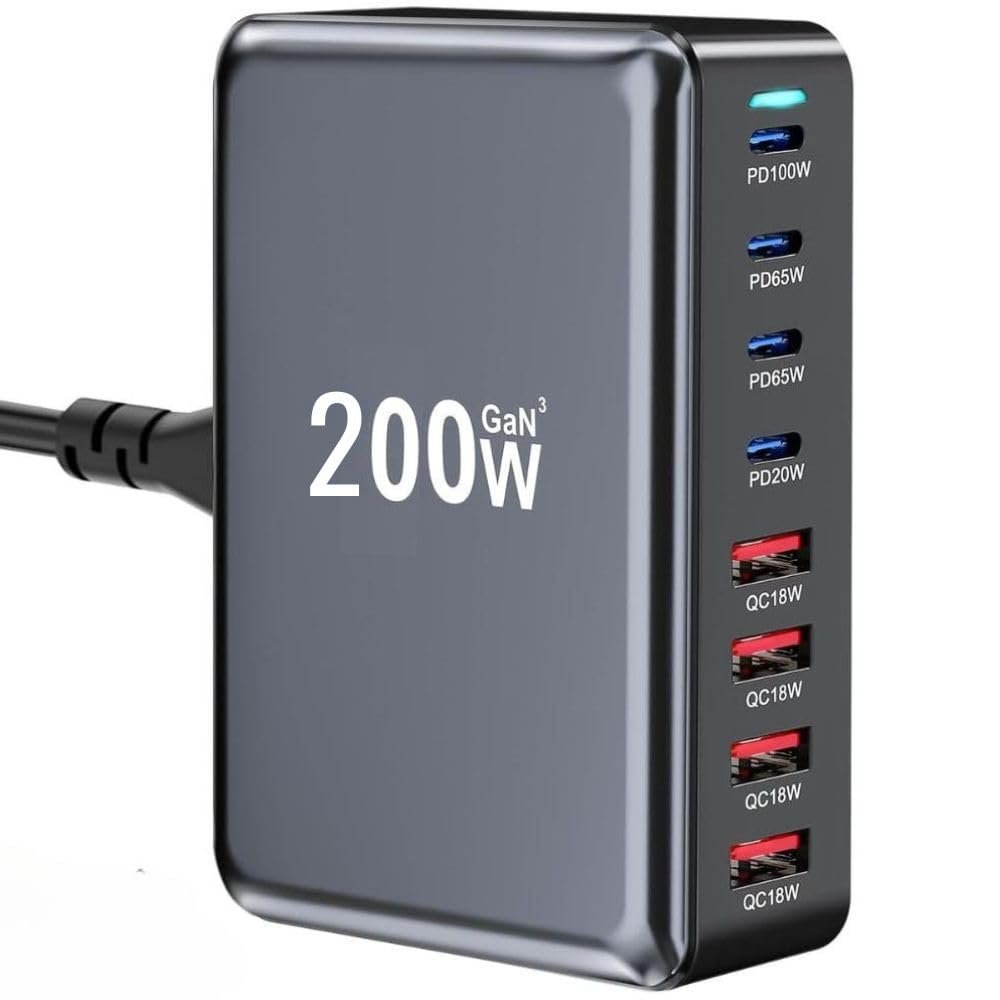 - 【8-in-1 Fast Charging with 200W Power】: Features 4 USB-C ports (PD 100W, PD 65W X 2, PD 20W ) and 2 USB-A ports (QC18W), delivering powerful and efficient charging for laptops, smartphones, tablets, and other devices. Charge 8 devices simultaneously without slowing down.